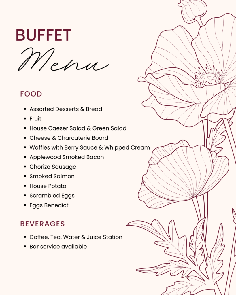 From fresh pastries and fruit to smoked salmon, eggs benedict, and warm waffles with berry sauce, there’s something for everyone to enjoy.